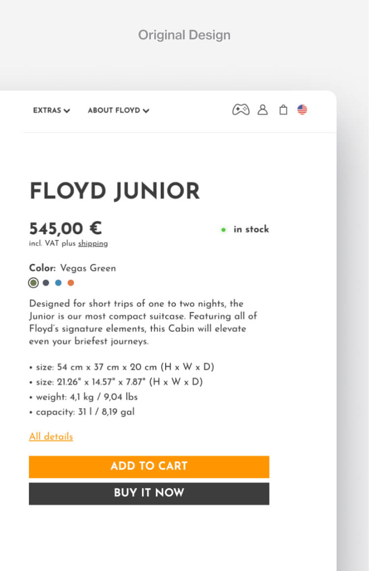 To align with Clarity, secondary products were grouped under an Extras category, keeping the focus on Floyd’s main items — suitcases and bags. Unnecessary icons such as language toggles and brand mini-games were removed for a cleaner interface. The Floyd logo was enlarged and recolored in black to strengthen Contrast and visual balance within the header.